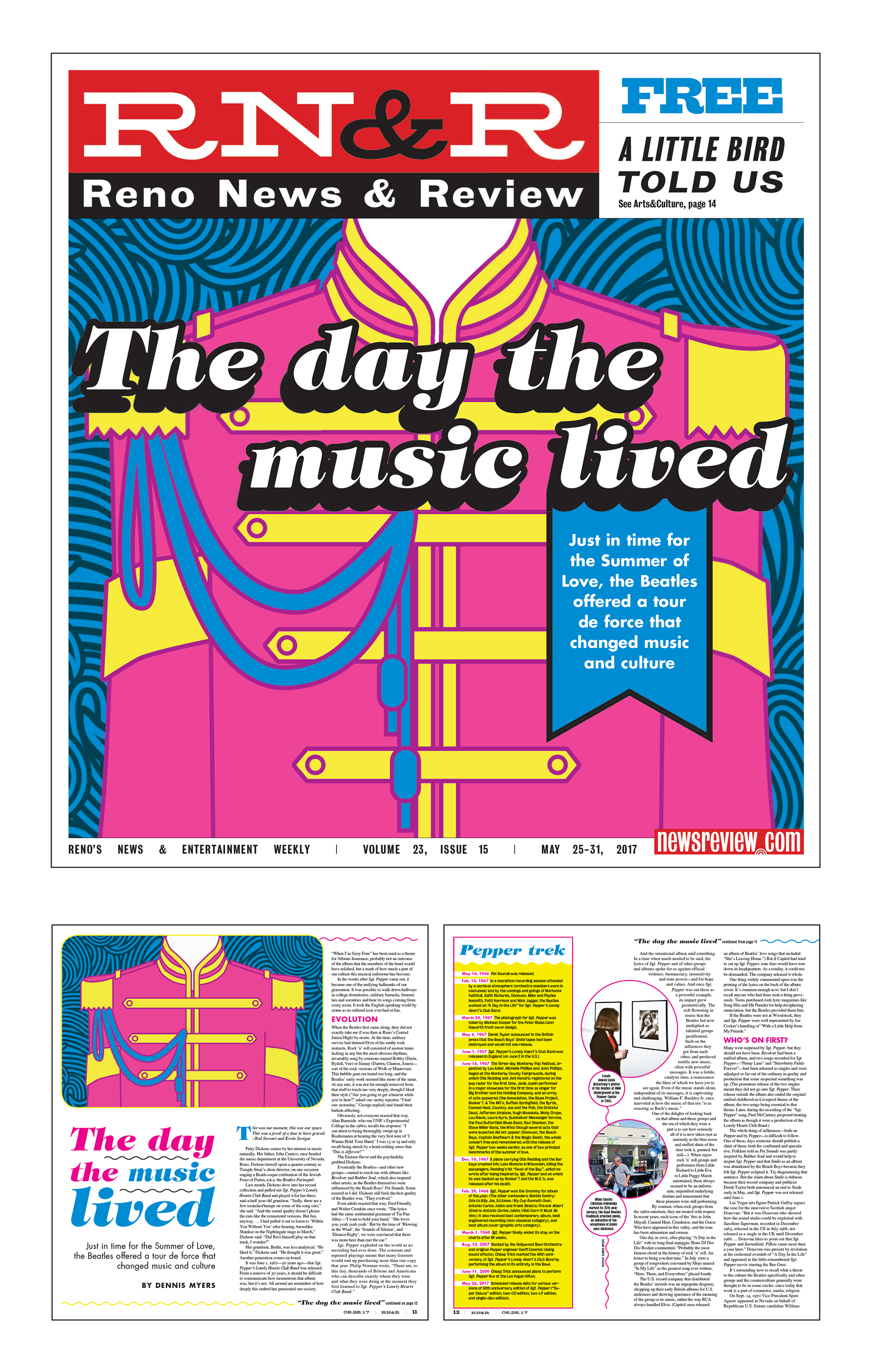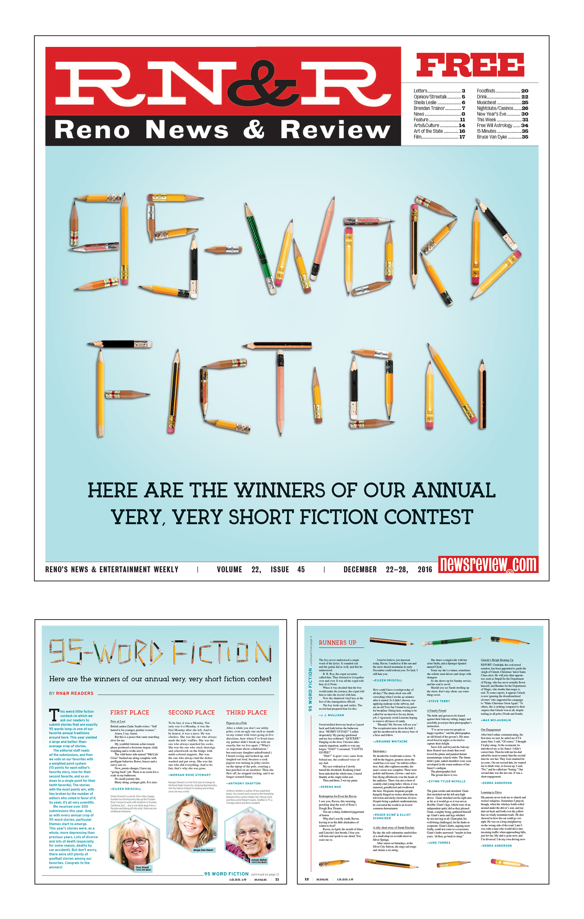 This is a selection of covers and interior feature pages for the alternative weekly paper Reno News & Review. The paper has a weekly circulation of about 30,000 copies and I served as Art Director there.
